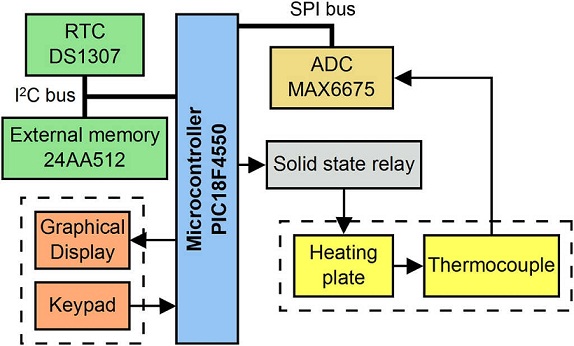 The oven was designed to operate with a power supply of 120 V (AC) at 60 Hz. Electrical current/voltage measurements showed that the mean power demanded by the electrical resistance (cartridge heater) was 60 W. The control system uses a microcontroller implemented on a specially designed electronic board, similar to the control system used in other devices reported in the literature (Affanni, 2013; Ahlers & Ammermuller, 2013; Devaraju et al., 2011; Oliveira, Freire, Deep, & Barros,1998). A schematic of the electronic components and the interconnections of the control system are shown in Figure 2. The microcontroller chosen for the control system is the PIC18F4550 (Microchip Technology, Chandler, USA), mainly because it includes a serial communication module which assists in the interconnection with other integrated circuits via an I2C protocol (Predko, 2008). Other relevant components used are an analog-to-digital converter (ADC) MAX6675 for K-type thermocouples (Maxim Integrated, San Jose, USA), a real time clock (RTC) DS1307 (Maxim Integrated, San Jose, USA), for the sampling time of the controller, and a solid state relay RM1A23D25 (Carlo Gavazzi Inc., Buffalo Grove, USA) used to control the resistance heater. In addition to the components listed above, the system includes a graphical display which shows information about the oven operation and temperature in real time and a keypad that allows the user's interaction and programming.