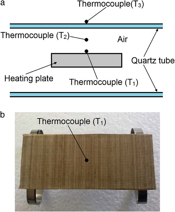 The main body of the oven consists of a 300 mm long quartz tube with 80 mm outer diameter and 2.5 mm wall thickness. The quartz tube has two solid aluminum lids made of 102 mm diameter circular plates. The oven is supported by a trapezoid-shaped steel base, which encloses the control system. A couple of internal supports for the body of the oven and C-shaped holders for fixing the tube and lids were manufactured from Nylamid plates, see Figure 1 a. C-holders at the end of the body of the oven hinge into two sections to allow the removal of the lids. Ceramic fiber-cloth was used to thermally isolate the supports from the oven body. Sealing of the oven is achieved by Viton® O-rings hermetically adjusted between the quartz tube and aluminum lids. The aluminum lids include feedthroughs for electrical wires, which connect the heating element contained inside the quartz tube to the power supply, as well as for thermocouples and wires. K-type thermocouples were used to measure the temperature inside the oven, with the reference one located typically over the heating plate or directly over the sample (depending on the experiment), see Figure 1 b. The aluminum lids also have connectors for potential gas supply, although this feature was not used herein. The heating element was fabricated from a 12.7 mm thick rectangular aluminum plate with in-plane dimensions of 95 mm by 38 mm, containing an electric cartridge heater (electrical resistance) supplied with 120 V AC at a nominal frequency of 60 Hz. The heating plate also contains a small hole which receives a thermocouple for temperature monitoring. The oven lids can be removed to introduce the samples, placing thermocouples or simply to access the heating plate. To prevent samples from sticking to the heating plate, a Teflon-coated fiber glass fabric cover (∼200 μm) was used.