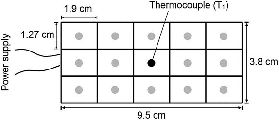 To investigate the spatial distribution of temperature on the surface of the heating plate (Fig. 3b), measurements at different locations were conducted in a second experiment. In this experiment, a grid of 15 rectangles of 12.7 mm by 19 mm was drawn on the top surface of the heating plate, and the temperature at the center of each small rectangle was taken as representative of such areas, as shown in Figure 4. This experiment allowed assessing the uniformity in temperature on the heating plate.