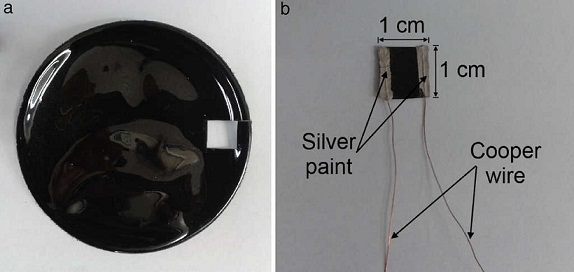 Fig. 6 MWCNT/PSF composites for thermoresistive characterization using the constructed oven: (a) as-produced MWCNT/PSF wafer, (b) final specimen.