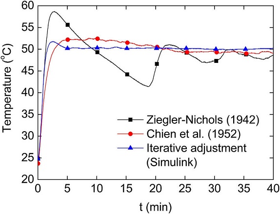 As an example of the outcomes of the three methods discussed, Figure 8 shows an experiment where a step function of 50 °C was aimed. As seen from this figure, the Ziegler and Nichols (1942) method yields significant overshoots near t = 2.5 min, which slowly decrease thereafter. The Chien et al. method (Chien et al., 1952) greatly reduces those overshoots, but it demands more than 25 min to stabilize the temperature. The best performance is achieved by setting the control parameters to those found iteratively by the "Simulink" MATLAB® tool, which reaches temperature stabilization in about 5 min.