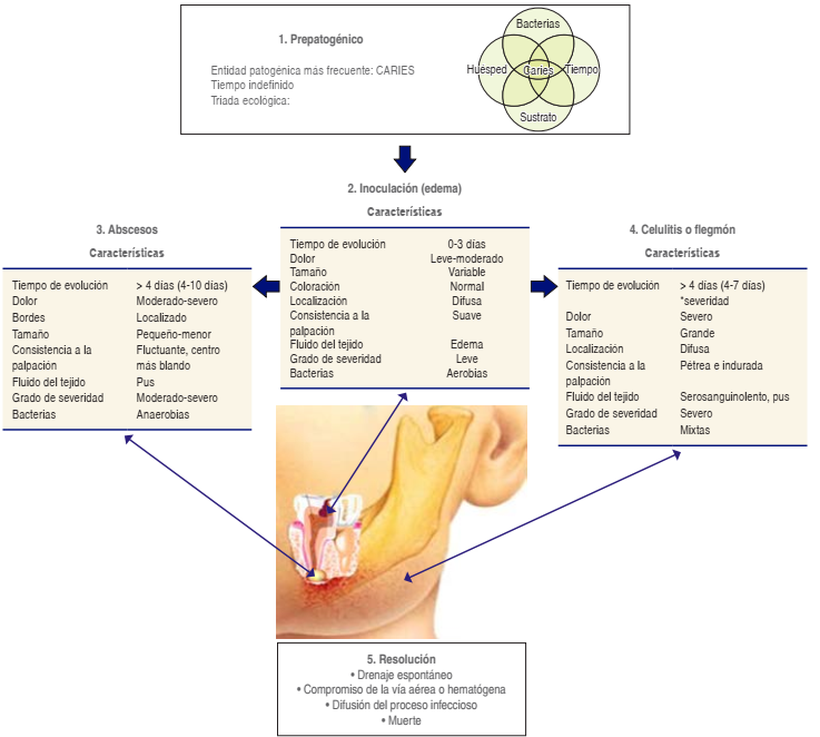 Figura 1 Estadios de las infecciones odontogénicas según la historia natural de la enfermedad y sus principales características.