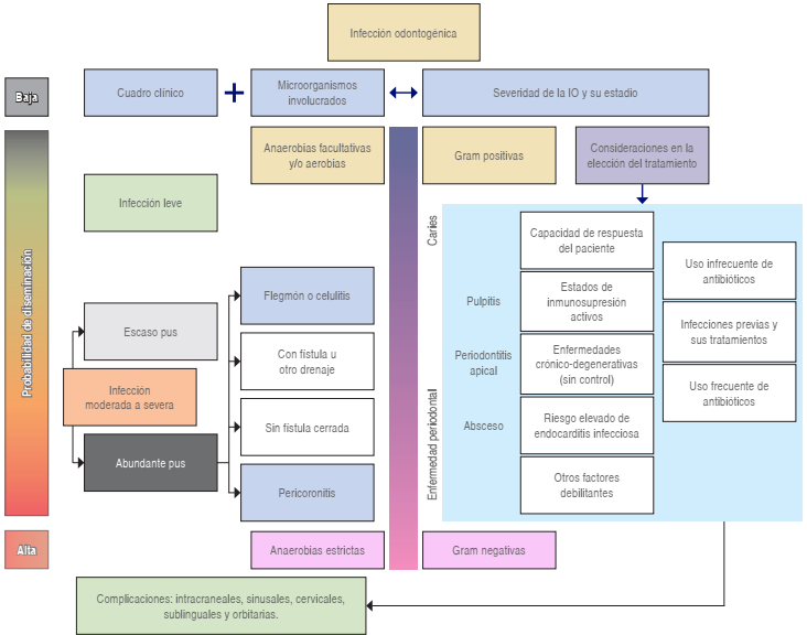 La infección odontogénica (IO) es la invasión y/o multiplicación de microorganismos patógenos hacia las estructuras dentales o tejidos circundantes, las más frecuentes son: caries, gingivitis, periodontitis y pericoronitis;1 son polimicrobianas, mixtas2 y por su localización primaria, producen sintomatología local intensa, limitación de las funciones orales, pérdida dental, compromiso sistémico e incluso la muerte.3