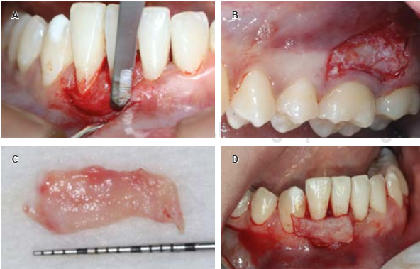Figure 2 A) Incision at the recipient site. A partial thickness flap was designed with a a «Hu-Friedy MB64» micro scalpel in order to create a vascular bed. B) Donor site, located on the buccal aspect of tooth 1.6 after extraction of the partially thick tissue for graftingthrough a rectangular-shaped incision, chosen for this purpose. The integrity of the gingival margin was preserved; C) The graft was de-epithelialized after extraction, measuring 14 × 5 × 1 mm. D) Minimally invasive free gingival graft placed on the recipient site.