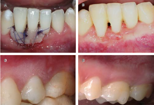 Figure 3 A) The graft was sutured with nylon thread, 6-0 non-resorbable «Atramat» suture, using a suspensory technique. B) Recipient site two weeks after surgery. Swelling still remains but a thickening of the phenotype and partial coverage of the GR can be noticed; C) Donor site two weeks after surgery, complete recovery of the gingival tissues is shown; D) Donor site five months after surgery. There are no scars or alterations of the surrounding gingival tissues.