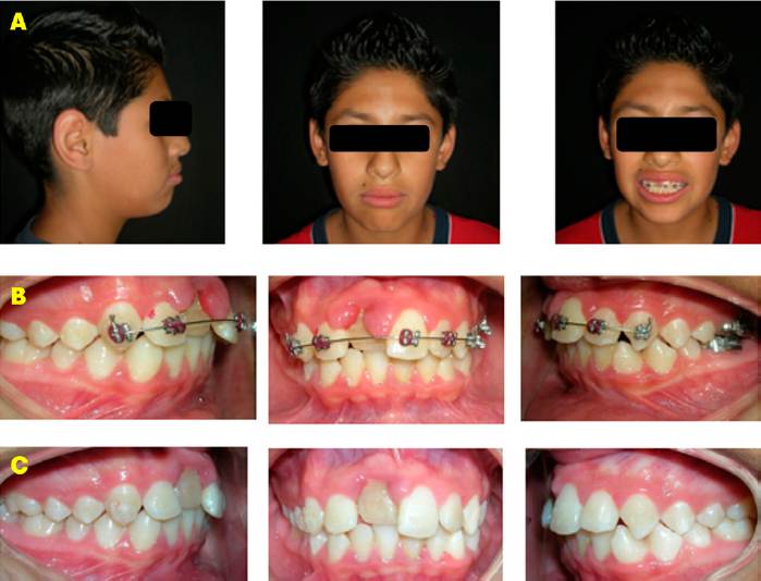 Figura 1 Fotografías iniciales. A. Extraorales en diferentes ángulos. B-C. Intraorales con y sin aparatología, donde es evidente la malposición del diente 11.