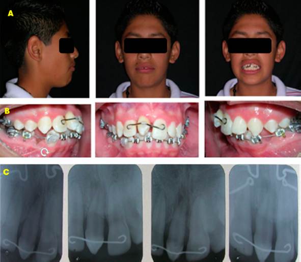 Figura 4 Fotografías de avance. A. Extraorales. B. Intraorales con aparatología inferior. C. Serie de radiografías dentoalveolares, donde se observa el diente trasplantado sin reacción apical.