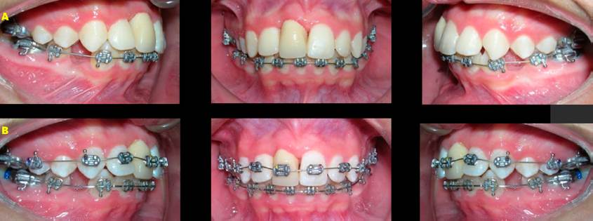 Figura 5 Progreso del tratamiento. A. Ajuste y colocación de provisional en el diente 11. B. Colocación de aparatología superior.