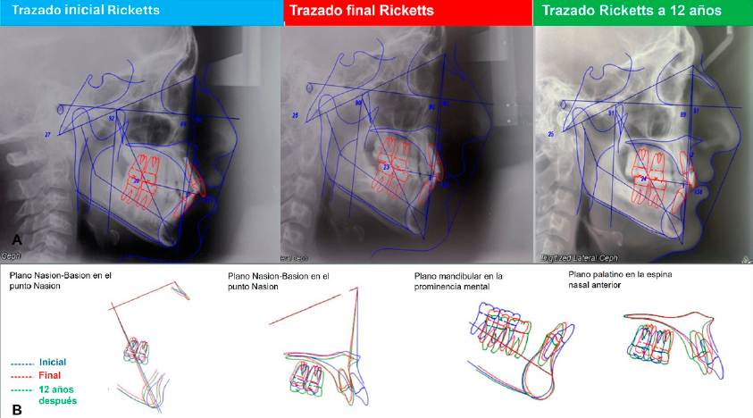 Los valores cefalométricos de pretratamiento, postratamiento y evaluación cefalométrica 12 años después del tratamiento de ortodoncia están en la Tabla 1. Las superposiciones entre los tres trazados cefalométricos muestran cambios en las medidas cefalométricas al comienzo de T1, T2 y T3. El análisis cefalométrico postratamiento destaca efectos dentarios, con retro inclinaciones de la arcada superior e incisivos inferiores, modificando también un aumento del ángulo interincisal. En la evaluación a los 12 años del tratamiento no se observan cambios en la posición de los incisivos superiores e inferiores (Figura 8).