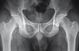 Figura 1: Radiografía anteroposterior de pelvis que muestra alteración de la unión de la cabeza con el cuello femoral izquierdo.