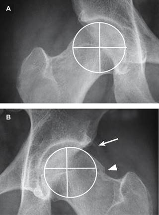 Figura 2: Acercamiento de la imagen anterior que muestra en (A) cadera derecha con eje normal de la cabeza femoral. B) Cadera izquierda con eje de rotación en un punto excéntrico a su centro geométrico que corresponde al diagnóstico de pinzamiento femoroacetabular en leva.