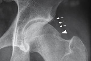 Figura 3: Imagen radiográfica con acercamiento cadera izquierda que muestra: calcificación laminar de cápsula articular en su porción externa (flechas) y osteofito en “giba” en la unión cabeza-cuello (cabeza de flecha).