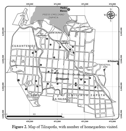 Study area. Tilzapotla is located in central Mexico, in the municipality of Puente de Ixtla, southern Morelos (Figure 1), between 18° 37' 02" and 18° 38' 32" north and 99° 17' 27" and 99° 19' 26" west, with an average elevation of 1,004 m This region exhibits a warm sub-humid climate of the Awo"(w)(i')g type, a mean annual temperature of 22 °C, and an average annual rainfall of 800 mm (García, 2004). The vegetation is described as a tropical deciduous forest, with relics of oak forest (Rzedowski, 1978). Tilzapotla was founded in 1919 and has 4,789 inhabitants (INEGI, 2010a), whose activities are dedicated to mining, livestock, irrigation and wet season agriculture. The land tenure is communal; sorghum (Sorghum bicolor Moech), corn (Zea mays L.), sugarcane (Saccharum officinarum L.) and beans (Phaseolus sp L.) are grown for sale and direct consumption. Migration to the USA has generated dynamic communication and knowledge exchange regarding the management of home gardens.