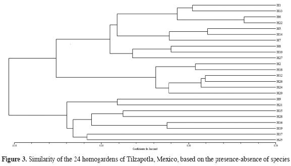 Similarity in species composition. There was low similarity in the species composition between home gardens, and some differences were found (Table 3, Figure 3). Three groups were recognized (Table 3). The first group was the largest and included nine out of 24 home gardens. All of the home gardens in groups I, II and III contained lime trees (Citrus aurantifolia), and group III was distinct due to including many fruit trees, such as guamúchil (Pithecellobium dulce), banana (Musa paradisiaca), guayaba (Psidium guajaba), and ciruela (Spondias mombin). The H15 - H19 subgroup of group III shared fruit trees, and the single shared species subgroup, H27 - H25, of group II corresponded to Citrus aurantifolia. The H12 - H20 subgroup species and H8 - H27 subgroup of group I were distinct from the other home gardens because they included a large number of ornamental plants.