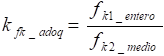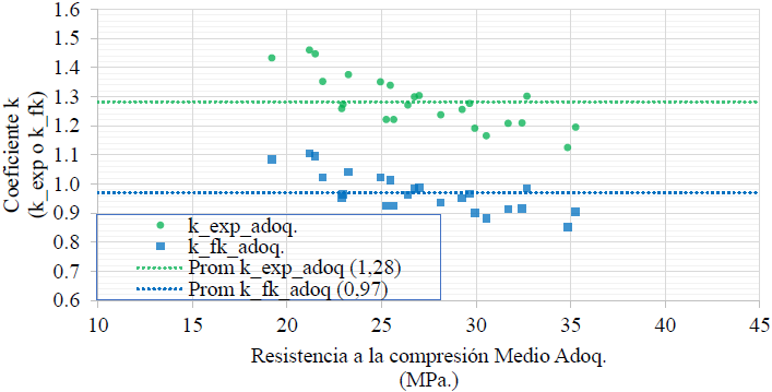 Para poder vincular los resultados experimentales se define el coeficiente kexp_adoq, como el cociente entre los resultados de resistencia de adoquín entero y medio adoquín, según la ecuación (7). De forma similar se define el coeficiente kfk_adoq como el cociente entre las resistencias normalizadas a esbeltez 2, según la ecuación (8).