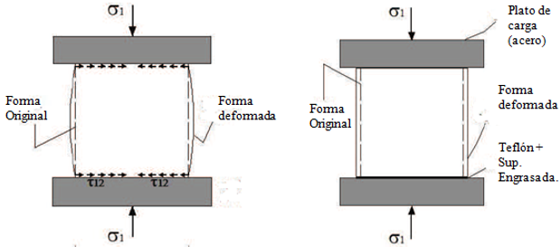 Para elementos de baja esbeltez el efecto de restricción (Figura 1) se puede constatar por la diferencia entre la deformación lateral que sufre el elemento cuando está sometido a la restricción de los platos de carga (sometido a un esfuerzo de compresión (σ1 y un esfuerzo de fricción (τ12) (Figura 1a) y cuando no lo está (sometido únicamente a (σ1, por ejemplo, interponiendo una lámina de teflón entre la superficie engrasada del elemento y los platos de caga) (Figura 1b). Esta restricción al movimiento junto con una baja esbeltez influye sobre el resultado de resistencia a la compresión del ensayo (Barbosa et al., 2010).