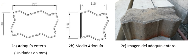 Figura 2 Sección del adoquín entero (2a) y medio adoquín (2b), e imagen de los adoquines ensayados (2c).