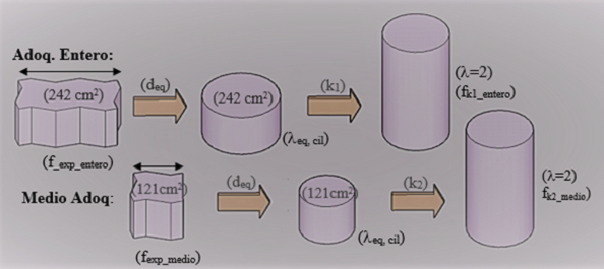 Ya que se asume que la principal diferencia entre ambos tipos de adoquines fue su largo, se analizó la influencia de esta variable en el resultado del ensayo a compresión. Aplicando la ecuación (3) se obtuvo el diámetro equivalente d eq para cada tipo de adoquín y se calculó la esbeltez equivalente λeq,cil según (4). A partir de este parámetro y de los coeficientes que surgen de la bibliografía (coeficientes IM de la Tabla 1) se obtuvo el resultado de resistencia normalizado para ambos tipos de adoquines (f k1_entero y fk2_medio según ecuaciones (5) y (6)).