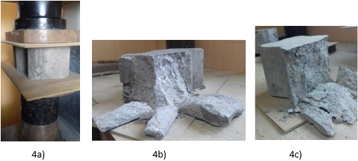 Figura 4 Imagen de adoquín entero listo para ensayo (4a), rotura típica de adoquín entero (4b) y rotura típica de medio adoquín (4c).