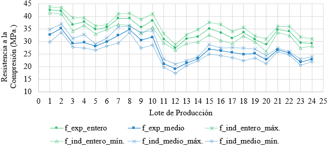 El gráfico de los resultados experimentales de resistencia en adoquín entero y en medio adoquín permitió visualizar la evolución de la resistencia de los lotes ensayados (Figura 5). Allí se indican los valores promedio por lote (fexp_entero y fexp_medio) y los resultados individuales máximo y mínimo en cada lote para ambos tipos de adoquines (find_entero_max y find_entero_min para adoquines enteros y find_medio_max y find_medio_min para medios adoquines). Los resultados están expresados en MPa.