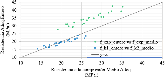 Al normalizar el resultado de resistencia a elementos de igual tamaño se obtuvieron resultados similares: los puntos correspondientes a fk1_entero vs fk2_medio están muy próximos a la recta y=x según se visualiza en el gráfico de la Figura 6. Por lo tanto, la principal diferencia entre los resultados experimentales puede ser asociada al coeficiente considerado.