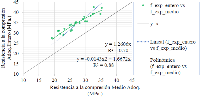Como se indicó en 3.2, cuando la resistencia aumentó, la diferencia entre el resultado de adoquín entero y medio adoquín disminuyó, por lo tanto, el coeficiente que los relaciona varía en función del nivel de resistencia (coeficiente kexp_adoq). De aquí que, para valores mayores de resistencia los puntos en el gráfico fexp_entero vs fexp_medio estén más próximo de la recta y=x (Figura 8). Esto refuerza el hecho de que el modelo de función polinómica presentó un mejor ajuste.