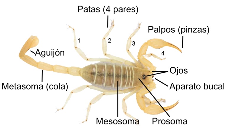Figura 1 Anatomía básica de un escorpión (escorpión de dunas, Smeringurus mesaensis). Se muestran sus 4 pares de patas, palpos modificados (pinzas), metasoma (cola con 5 segmentos) y aguijón.