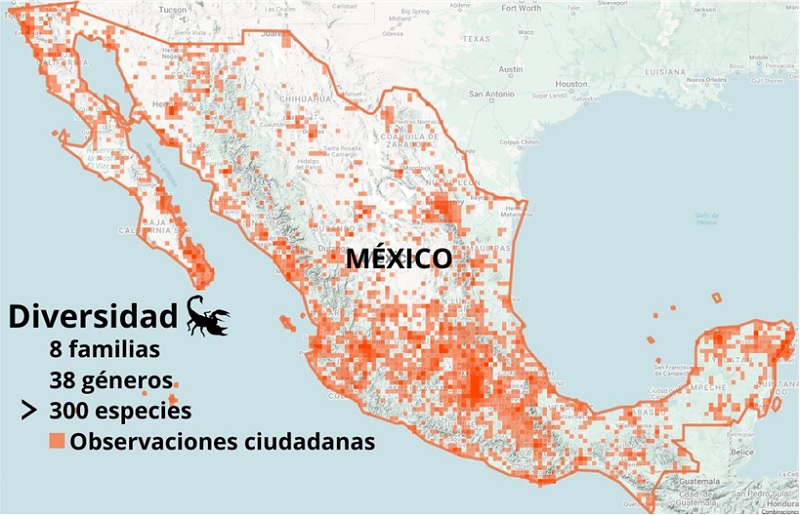Figura 2 Mapa de observaciones ciudadanas de escorpiones en México, datos obtenidos de iNaturalistMX [10].