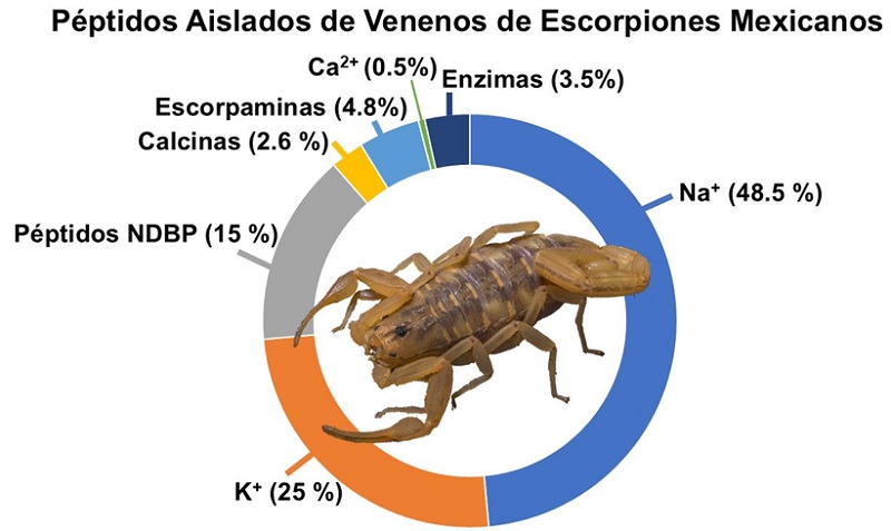 Existen reportes que mencionan que el contenido de familias de toxinas, en venenos de escorpiones mexicanos, está principalmente compuesto por toxinas que afectan a canales iónicos, como las α y β-toxinas, modificando el cierre y apertura, respectivamente, de canales de Na+. En la Figura 3 se muestra el contenido de distintos tipos de toxinas que se han caracterizado en algunos venenos de escorpiones mexicanos. Actualmente resulta sumamente interesante contar con las herramientas necesarias para profundizar en el conocimiento del contenido de toxinas de venenos de estos animales, lo anterior puede impulsar la investigación y el desarrollo de productos como medicamentos.