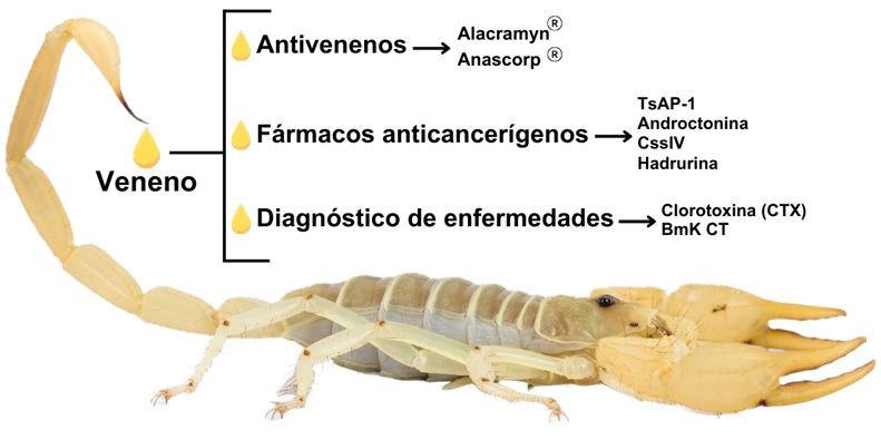 Previamente se ha reportado que el principal interés con respecto a la caracterización de venenos de animales suele tener un enfoque médico [1]. Lo anterior toma bastante sentido cuando consideramos que, necesitamos saber qué agentes son los que ocasionan estragos en la salud por mordeduras o piquetes de animales venenosos. De manera muy interesante, en los últimos años hemos visto una serie de reportes de investigación donde se ha evaluado el potencial que tienen extractos de veneno total, así como toxinas aisladas y/o purificadas, en el sector biotecnológico [5], [17], [20]. Por ejemplo, en la Figura 4 se destacan algunas propiedades del veneno de escorpiones, como la producción de antivenenos (faboterápicos de 3a y 4a generación), detección de enfermedades y propiedades anticancerígenas.
