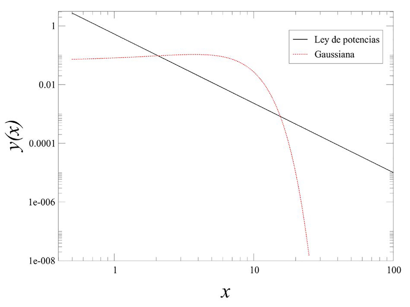 La ley de escalamiento de Pareto discutida anteriormente nos da una idea de las consecuencias de que la riqueza esté distribuida en la sociedad de acuerdo con una ley de potencias. Para entender bien el significado de esta distribución, comparemos con lo que ocurriría si los sueldos estuviesen distribuidos gaussianamente1 de tal forma que la probabilidad de que una persona gane un sueldo x estuviese dada por