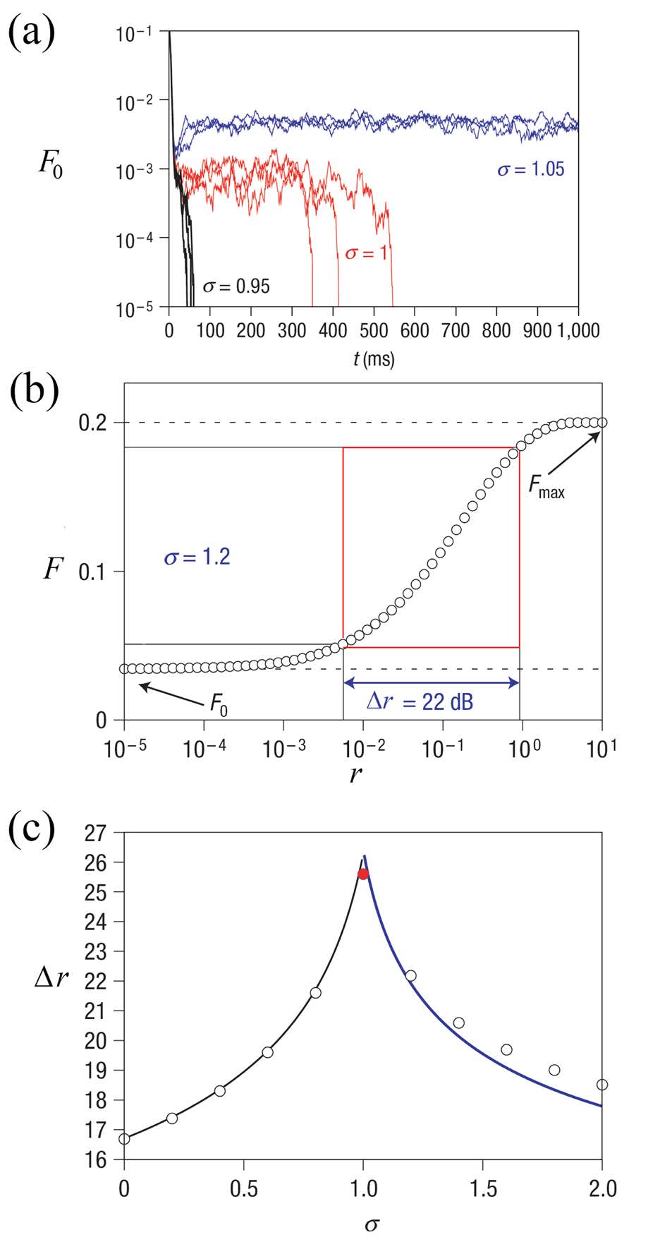 El resultado importante del trabajo de Kinouchi y Copelli es haber demostrado que el rango dinámico de la red alcanza un valor máximo justo en el punto crítico σ = 1, como se ilustra en la Figura 10c. Es decir, que es justo en el punto crítico en donde la red tiene la capacidad de distinguir más eficientemente entre estímulos de diferentes intensidades, tanto los muy tenues como los muy intensos. Esto sugiere que el enorme rango dinámico del cerebro, tanto para percibir estímulos auditivos como visuales, puede deberse a que está operando en punto crítico.