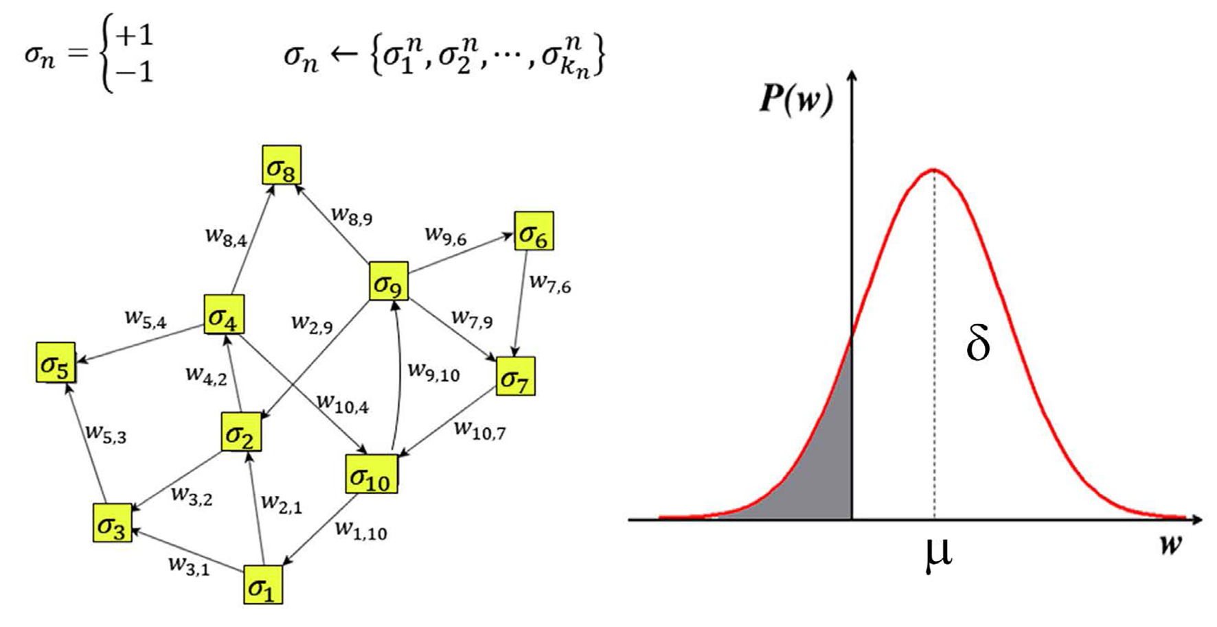 }, cada uno adquiriendo el valor +1 o -1 dependiendo de la opinión de la persona a la que representa. Cada nodo σ