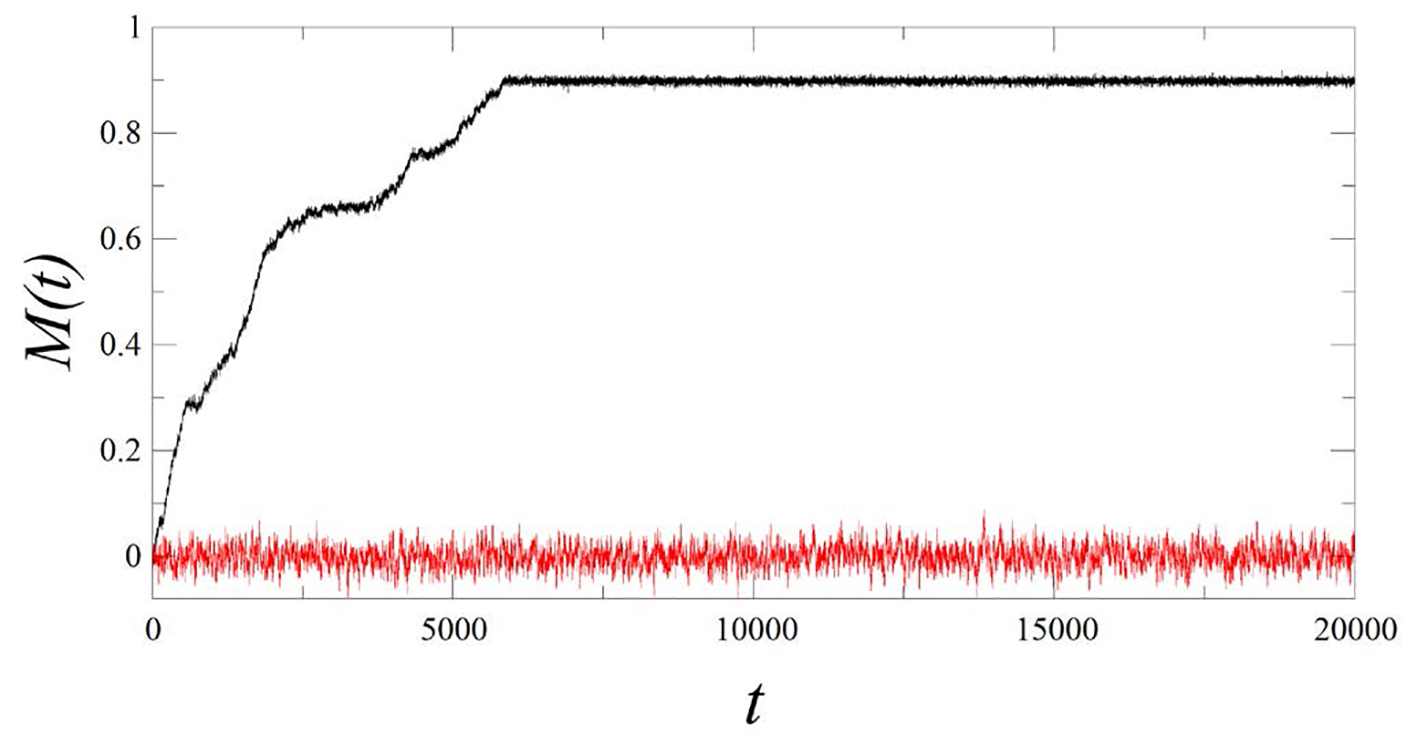 Nota: La curva negra corresponde a q = 0.05 y α = 1.5, mientras que la curva roja se calculó con q = 0.25 y α = 0. En ambos casos el sistema parte de una condición inicial aleatoria en la que aproximadamente la mitad de los nodos tiene el valor +1 y la otra mitad el valor -1. Nótese cómo para el primer conjunto de parámetros la red alcanza un estado ordenado estacionario con un valor promedio M = 0.9, mientras que en el segundo caso la red nunca sale del estado desordenado.