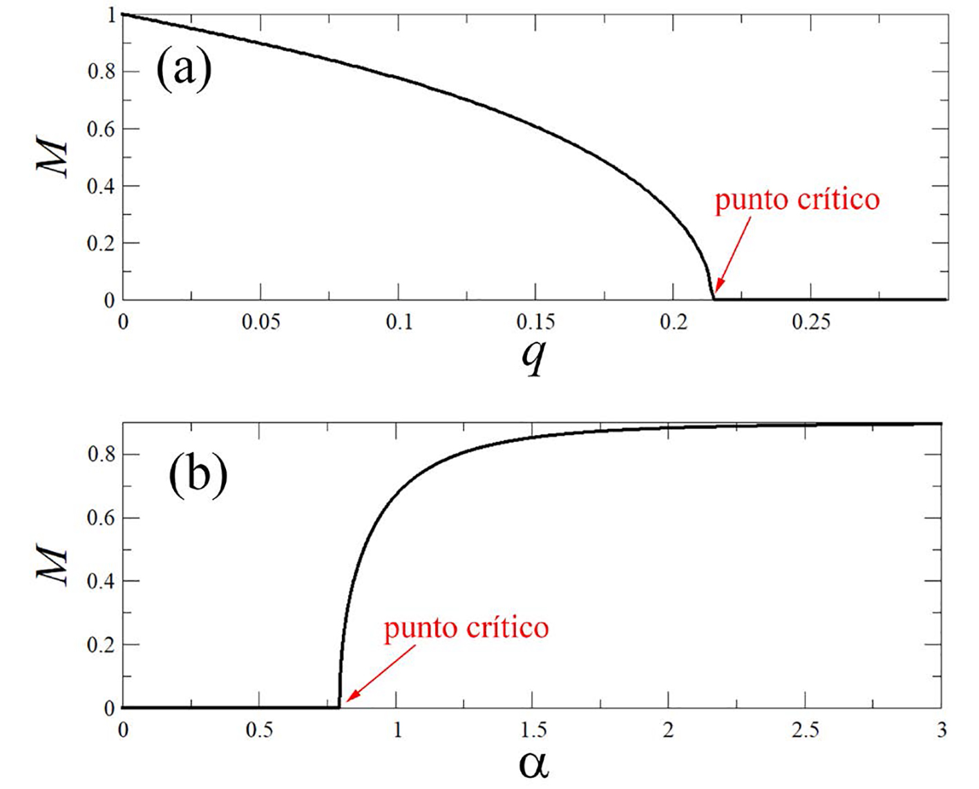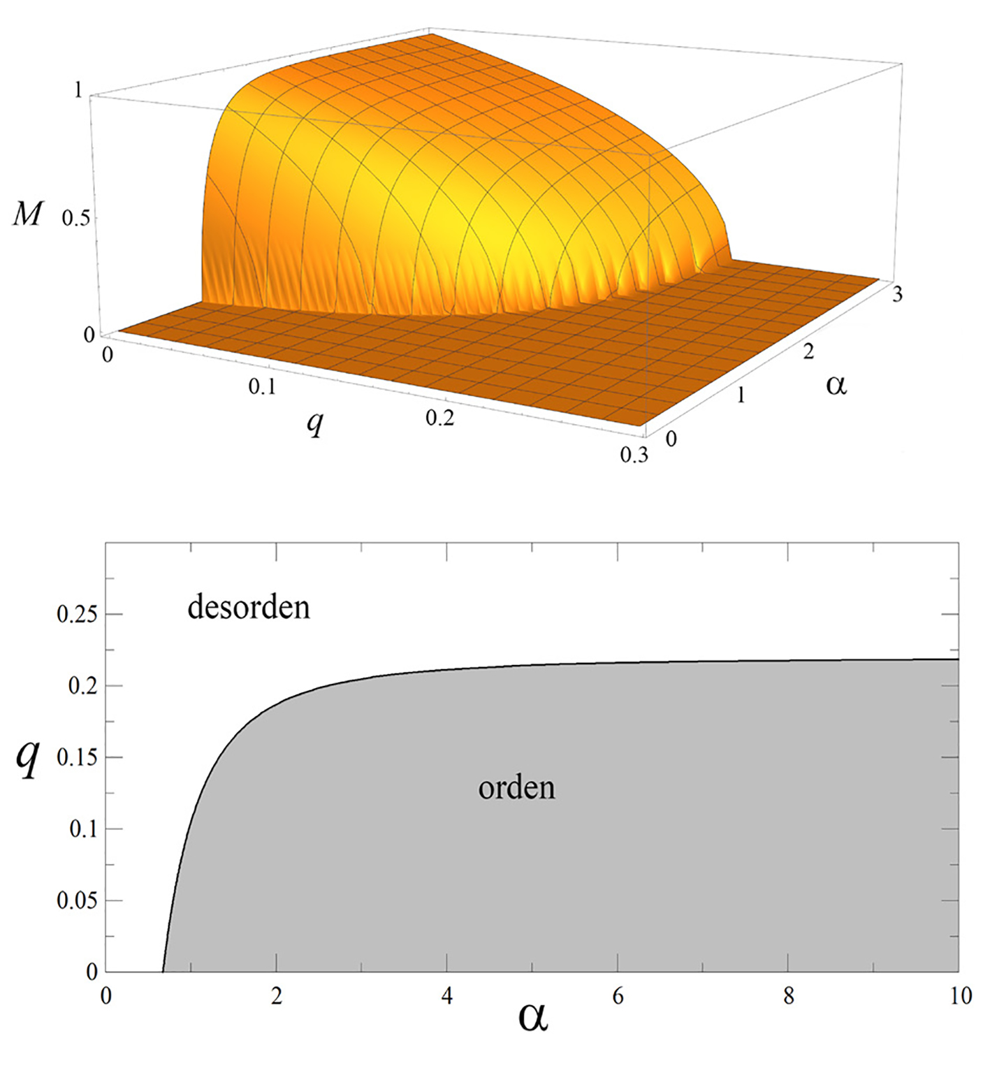 Nota: (a) El panel superior muestra el parámetro de orden M como función de los parámetros de control q y α; también muestra el diagrama de fases indicando las fases ordenada (M > 1) y desordenada (M = 0). La curva que separa estas dos fases (panel inferior) es la curva crítica. Es decir, cualquier punto de esta curva es un punto crítico.