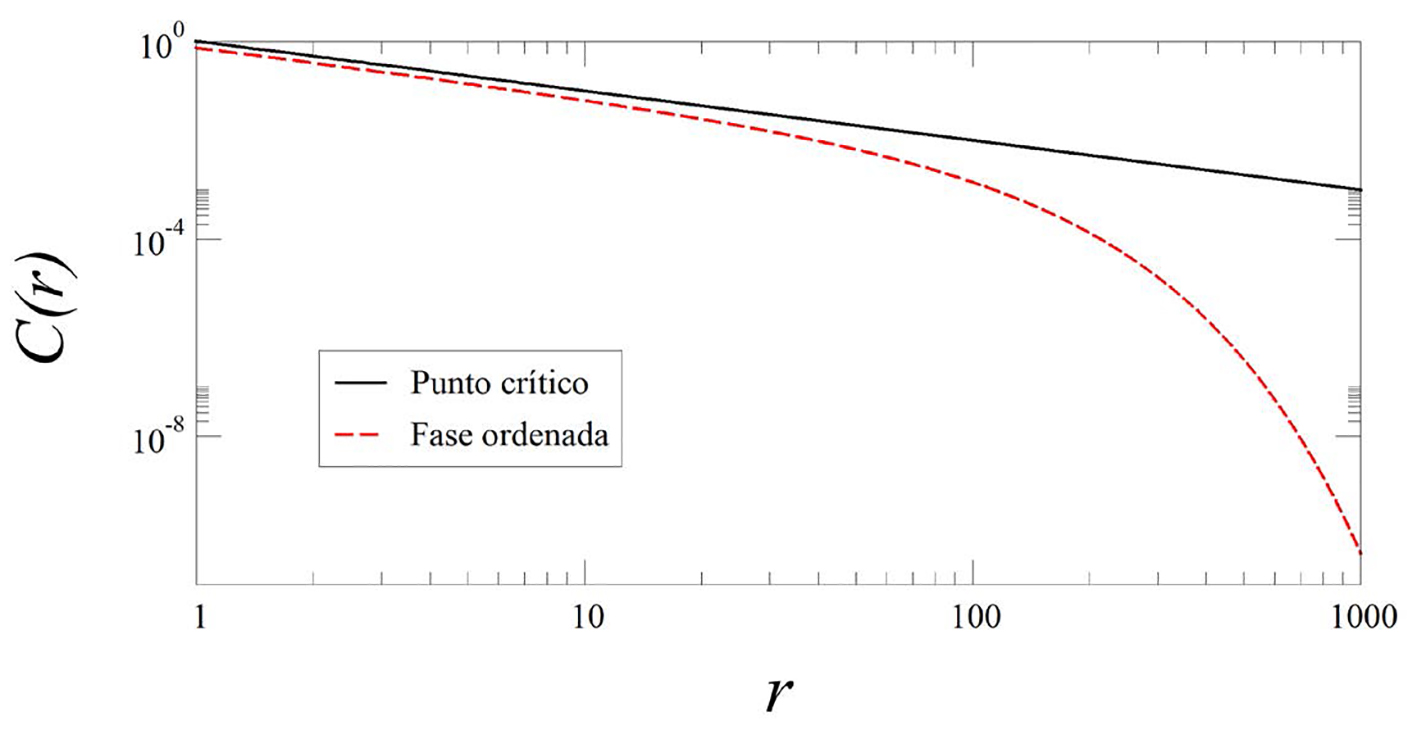 donde ν es un exponente positivo. La implicación importante de la ecuación anterior es que al acercarnos al punto crítico, es decir, cuando α → α c y q → q c , se tiene que ξ → ∞. Es decir, en el punto crítico la longitud a la cual los nodos se correlacionan se hace infinita (del tamaño de todo el sistema). Esto queda manifiesto en la Figura 6 con los dominios verdes y negros que atraviesan todo el sistema. La existencia de esos dominios se debe precisamente a que la longitud de correlación se hace infinita, de donde resulta también, a partir de la ecuación (12), que en el punto crítico la función de correlación queda como una ley de potencias: C(r) ≈ r η . La Figura 7 muestra la gráfica de C(r) en la fase ordenada y en el punto crítico. Como puede verse, en la fase ordenada la correlación entre nodos decrece muchísimo más rápido con la distancia que en la fase crítica. Por lo tanto, aun cuando en la fase ordenada existe un gran dominio que abarca uniformemente todo el sistema, eso no significa que los nodos en este dominio estén fuertemente correlacionados.