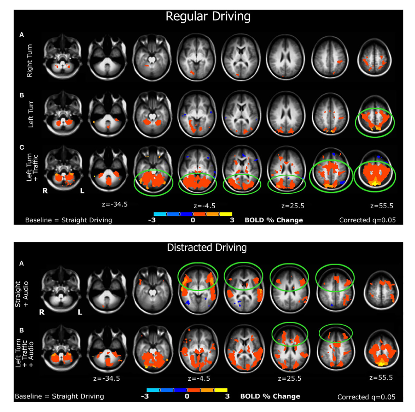 Figura 8 Imágenes de resonancia magnética funcional que muestran diferentes regiones del cerebro activándose o desactivándose conforme una persona en un simulador de manejo cambia de actividad.