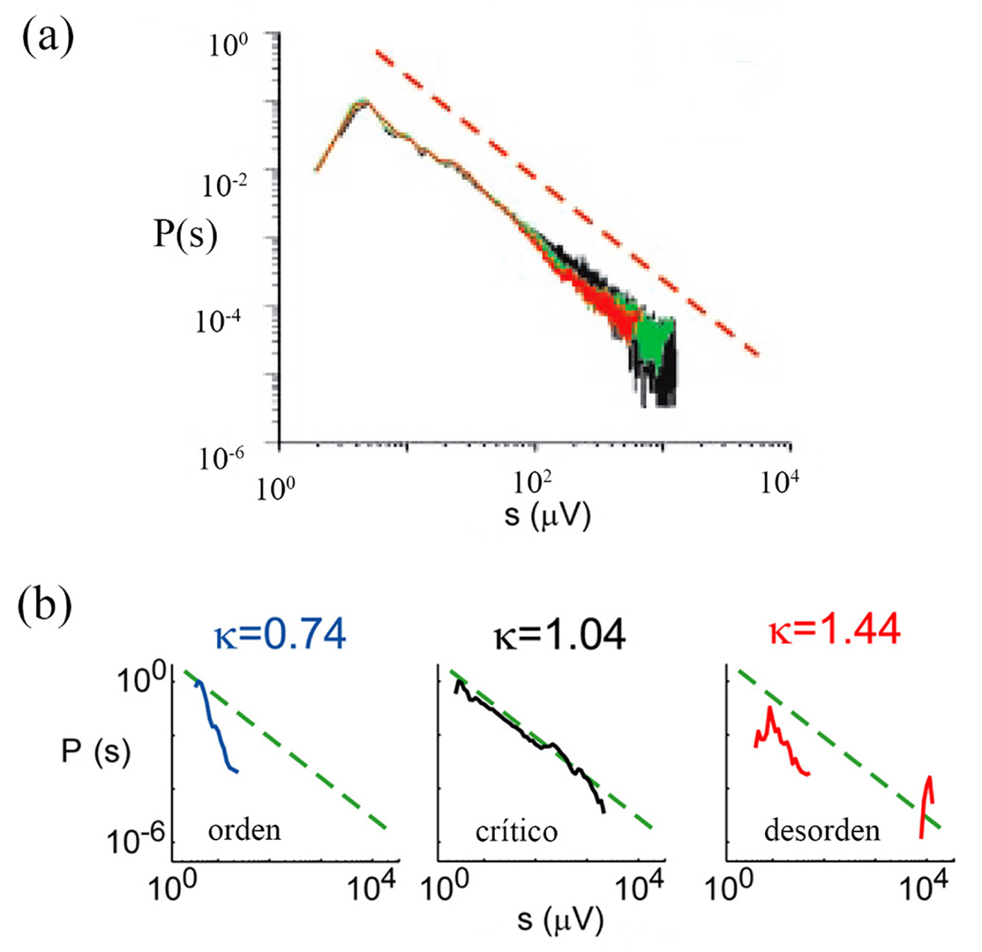 Notas: (a) En tejido neuronal normal, la distribución de avalanchas obedece a una ley de potencias P(s) = Cs -1.5. Las diferentes curvas corresponden a diferentes cultivos del tejido neuronal (la curva punteada es una guía que muestra la ley de potencias exacta). (b) Cuando se bloquean los receptores de glutamato o de ácido γ-aminobutírico se puede cambiar la fracción de conexiones sinápticas activadoras versus inhibidoras, llevando así al sistema neuronal a la fase ordenada o a la fase desordenada. El parámetro κ es una medida de qué tan alejada está la dinámica del punto crítico, con κ < 1 correspondiendo a hipo-activación (fase ordenada), mientras que κ > 1 corresponde a hiper-activación (fase desordenada). El punto crítico se tiene para κ = 1. Como puede verse, en la fase ordenada las avalanchas son muy pequeñas, mientras que en la fase desordenada hay avalanchas muy grandes (nótese el pico arriba de s ≈ 104. Solo el tejido neuronal “normal” (sin ningún tipo de bloqueador, lo que en los experimentos corresponde a κ = 1.04) está en punto crítico, pues la distribución de avalanchas obedece una ley de potencias.