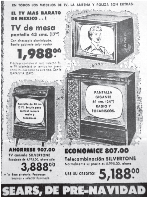 Para 1958 abundaba la publicidad que promovía la compra de televisores. Pese a que continuaba siendo un artículo de lujo, éste adquiría mayor popularidad y atractivo en los precios. Marcas como Silverstone, Philips, Westinghouse, Dumont, Skymaster, Stromberg, Packard Bell y Philco ofrecían aparatos con innovaciones tecnológicas y usos funcionales para atraer clientes. Por 108 pesos semanales, la Súper-Consola Majestic 1958 ofrecía tres aparatos en uno: televisor pantalla gigante (21 pulgadas), radio de 5 bandas y tocadiscos de alta fidelidad (4 velocidades, con amplificador de 12 watts y 6 bocinas), integrados en un mueble de madera, “que es un alarde de buen gusto”, exaltaba el anuncio en prensa.