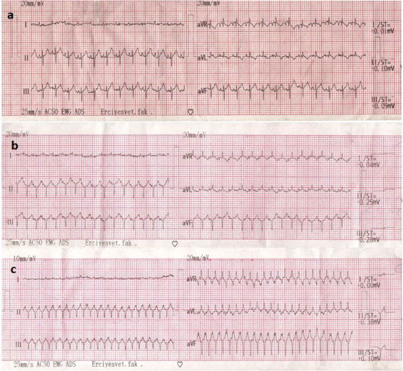 Figure 1 Examples of electrocardiogram prints showing different parameter results from anesthetized chicks. a) Normal sinus rhythm after medetomidine and midazolam administration, ST segment elevations. b) Sinus tachycardia after ketamine administration. c) Ventricular tachycardia after sevoflurane administration.