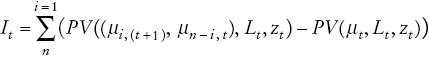 en el que μi(t+1) , μn−i,t representa el cambio en el ingreso medio que se hubiera producido de haberse modificado la fuente de ingreso i en la proporción que realmente lo hizo, mientras que las restantes fuentes de ingreso (n - i) y la distribución del ingreso total L permanecen inalteradas. Esto hace posible aislar el efecto ingreso de cada una de las fuentes individuales, de manera que la suma total de los efectos equivalen al efecto ingreso total.