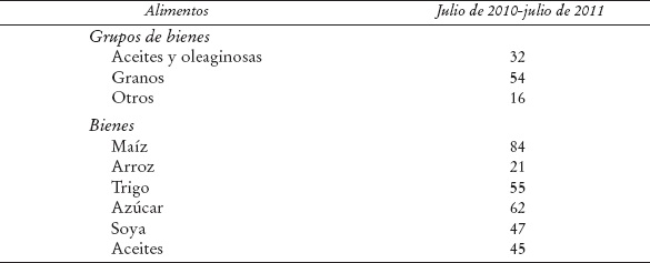 El Cuadro 1 muestra la evolución reciente de alimentos críticos para la subsistencia humana, y en especial para los pobres entre 2010 y 2011 y muestra que los incrementos en los precios internacionales del maíz, el arroz, el trigo, la azúcar, la soya y los aceites -todos ellos parte de la canasta alimentaria en México- fueron de 84, 21, 55, 62, 47, y 45%, respectivamente, en estos productos en el transcurso de solamente un año.3