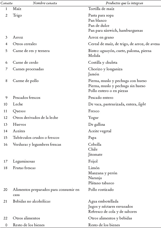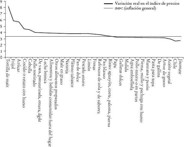 Un cuarto elemento, que ha adquirido importancia en años recientes, es el costo de la canasta de alimentos utilizada para cuantificar el valor de la línea de pobreza alimentaria. Hasta mediados del decenio de los 2000 los precios de estos bienes habían fluctuado en línea con la inflación general, o incluso se habían reducido como consecuencia de los rápidos incrementos en la producción mundial derivados sobre todo de cambios tecnológicos y de avances científicos. Productos específicos como el maíz, el trigo, el frijol y el arroz -que además de estar incluidos en sí mismos, se utilizan para producir otros alimentos procesados de la dieta básica de la canasta alimentaria- presentaron precios relativamente estables y en algunos casos a la baja, que incluso abarataron el costo de la línea de pobreza en algunos años. Una reducción en el valor de la línea de pobreza propicia una caída en la proporción de población pobre si el resto de sus determinantes se mantienen inalterados, ya que implica un incremento en la capacidad adquisitiva de los hogares en términos reales.
