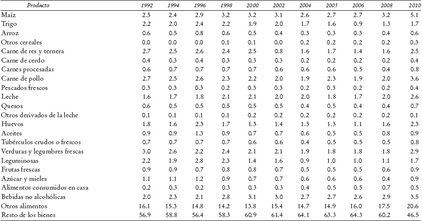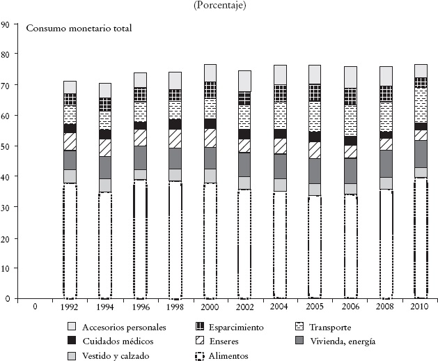 Además, es importante destacar que mientras los periodos 1992-1996 y 2006-2010 son de incremento en la pobreza, los años comprendidos entre 1996 y 2006 presentan una reducción sostenida. Este hecho es importante, ya que los ciclos económicos afectan el presupuesto de los hogares, lo cual también puede afectar su reacción a cambios en los precios. Dado que la elasticidad precio de la demanda de los productos incluidos en la canasta alimentaria tiende a ser baja, se esperaría que el porcentaje de recursos destinado a los alimentos en periodos de aumentos relativos de precios se incrementara, mientras que se reduciría en el caso contrario. Si los cambios en los precios se aúnan a modificaciones en el entorno económico, los efectos pueden magnificarse. Específicamente, en el periodo 2006-2010 se presentó una combinación de aumento de precios y de reducción en el ingreso, y ambos efectos tenderían a incrementar la importancia relativa de los alimentos como proporción del consumo total del hogar.