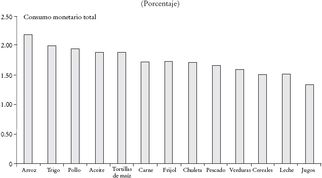 Nuestras pruebas llevan a concluir que 18 de los 22 productos de la canasta alimentaria son inelásticos. Es decir, son productos que los hogares tienden a seguir consumiendo a pesar de que se incrementa su precio. Entre estos productos destacan el huevo, los aceites, las verduras, los tubérculos, el frijol, las frutas frescas y los productos derivados del trigo, con las menores elasticidades, lo cual sugiere que la estrategia de los hogares consiste en “proteger” el consumo de estos bienes ante cambios adversos en el entorno. En el extremo opuesto se identifican productos como la carne de cerdo, las carnes procesadas, los pescados frescos y la leche, que los hogares dejan de consumir más que proporcionalmente cuando se aumenta su costo.