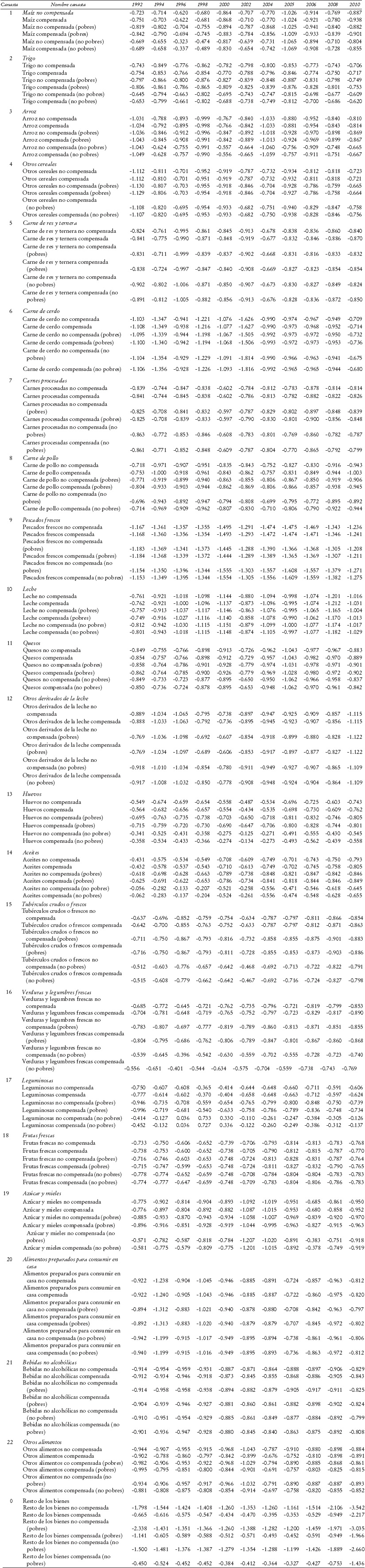 Las elasticidades se calcularon suponiendo simetría en la ecuación de Slustky, y se registran las elasticidades compensadas y no compensadas. Las elasticidades no compensadas del bien i respecto a un cambio en el precio del bien j son: