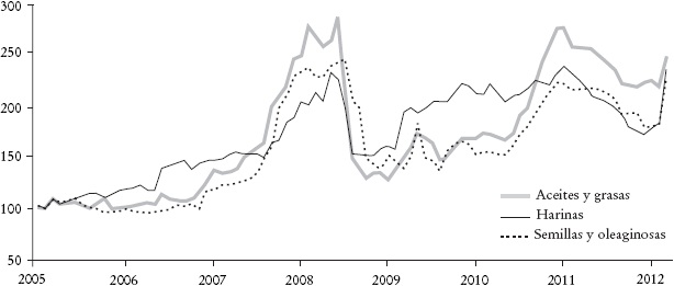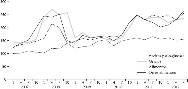 El desproporcionado aumento en los precios de los alimentos en años recientes ha sido parte de una tendencia general de incremento en el valor de los bienes primarios en los mercados internacionales. La Gráfica 1 muestra por ejemplo la evolución de los precios de los alimentos, los aceites y las oleaginosas, los granos y otros bienes de acuerdo con el seguimiento que realiza mensualmente el Banco Mundial (véase Food Price Watch, 2012). Claramente puede observarse que el precio de los granos alcanza un pico en el primer semestre de 2008 con incrementos de alrededor de 150% en su valor en sólo unos meses. A continuación los precios se reducen y permanecen más o menos estables entre diciembre del 2008 y junio del 2010 para volver a incrementarse en más de 100% hacia junio del 2011. Los alimentos en general y los aceites y las oleaginosas siguen la misma pauta.