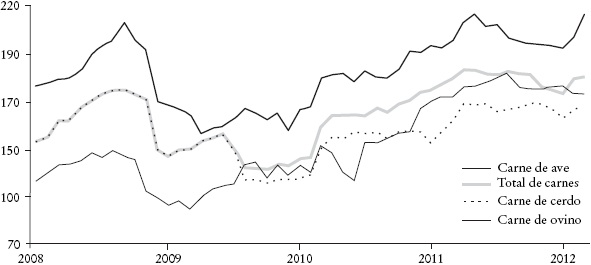 Estas tendencias se corroboran en el seguimiento a los precios mensuales de alimentos en los mercados internacionales realizado por la FAO, mostrados en la Gráfica 2. La perspectiva en este caso también llega hasta 2012 y permite identificar que entre 2005 y 2008 los aceites y las oleaginosas incrementaron su precio en casi 200%, mientras que las semillas lo hicieron en alrededor de 150% y las harinas en una proporción un poco inferior. Después de la reducción observada en 2009 los precios volvieron a incrementarse a montos similares a los observados en 2008 y se han mantenido cerca de sus valores desde entonces. La Gráfica 3 muestra pautas similares para los precios de la carne de ave, de ovino y de cerdo, todas evolucionando en la misma dirección y llegando a aumentos de casi 200% en el 2012.