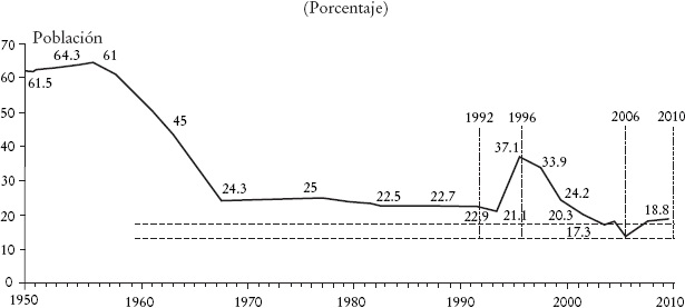 La gráfica muestra una tendencia general de disminución de la pobreza en los 60 años en observación. Específicamente se observa que en 1950 la pobreza alimentaria alcanzaba a 61.8% de la población total, mientras que seis decenios después, en 2010, la proporción es de 18.8%; es decir, hubo una reducción de 70% en la proporción de población pobre durante seis decenios. A lo largo de la serie se identifican cuatro puntos de inflexión: en 1968 en el que se detiene una pronunciada tendencia decreciente; en 1994 de incremento abrupto; en 1996 en el que cambia la tendencia hacia la baja, y 2008 en el que se suspende nuevamente la tendencia decreciente observada durante 1996-2006.9