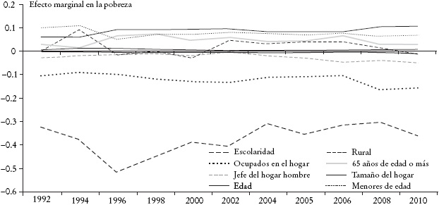La Gráfica 5 presenta una descripción general de las características del hogar que están más asociadas a la condición de pobreza alimentaria en los pasados dos decenios. Cada punto en la gráfica corresponde al valor del efecto marginal de la variable de que se trata, de la probabilidad de ser pobre alimentario, estimado a partir de una regresión probit con datos de las ENIGH. La gráfica refleja por una parte, que las asociaciones con la probabilidad de pobreza han sido más o menos estables en el tiempo durante el periodo 1992-2010 y, por otra, que las tres variables con una asociación mayor son la educación -que reduce la probabilidad de ser pobre alimentario en más de 30%-, el número de ocupados dentro del hogar -que tiene también un efecto negativo de alrededor de 15%- y el número de personas que integran el hogar -que incrementa la probabilidad en alrededor de 10%-. Si el jefe del hogar es del género masculino también se asocia a una menor probabilidad de pobreza, aunque en menor medida. Por otra parte, la edad del jefe, contar con un mayor número de personas mayores a 65 años y estar ubicado en un área rural, incrementa la probabilidad, aunque en una magnitud menor.